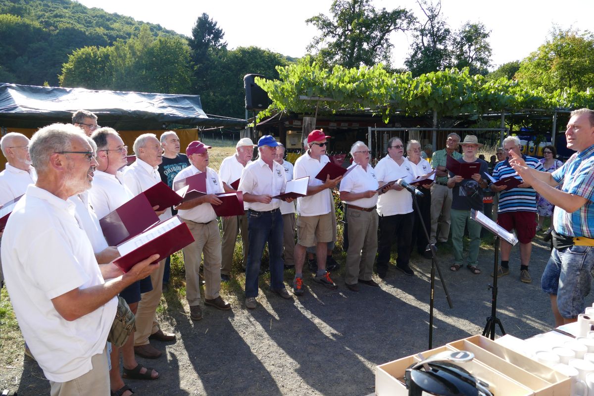 Zum Weinfest in den schönen Wiesengrund in Friesdorf hatte zum 31.08.2019 der Männerchor Friesdorf geladen. Gut vorbereitet von den Sängern, kamen bei Sonnenschein die ersten Gäste bereits gegen 15:30Uhr und erfreuten sich an Kaffee und selbstgebackenem Kuchen. Es war ein warmer Tag, sodass sich die Gäste lieber im Schatten der Apfelbäume aufhielten als im sonnendurchfluteten Zelt. Aber der Abend brachte kühlere Temperaturen und so schmeckten dann auch Zwiebelkuchen mit Federweißer, Würstchen und Steak bei leckerem Wein von der Ahr und Rheinhessen. Wer keinen Wein mochte, konnte bei alkoholfreien Getränken oder Stubbi die Geselligkeit pflegen. Der Männerchor Friesdorf freute sich an diesem Tag über die vielen Gäste, die bei bester Stimmung den Nachmittag und Abend auf der Festwiese verbrachten. Gegen 23:30Uhr konnte dann doch der Abbau von Gerätschaft und Zelten begonnen werden.